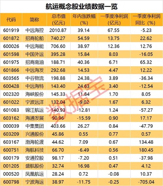 据证券时报·数据宝统计,A股中,航运概念股有20只,年内平均上涨12.65%,跑赢大盘;招商轮船、招商南油、中远海控、中远海能年内股价均上涨超30%。