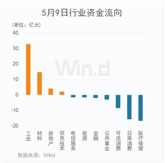 从5月9日行业资金流向来看,主力资金净流入约4亿元。其中,工业板块净流入额超30亿元,位居首位;材料等板块净流入额亦较大。医疗保健、日常消费等板块小幅净流出。