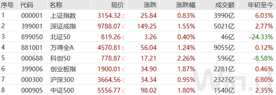 截至5月9日收盘,上证指数涨0.83%报收于3154.32点;深成指涨1.55%报收于9788.07点;创业板指涨1.87%报收于1900.01点,万得全A总成交9055亿元。