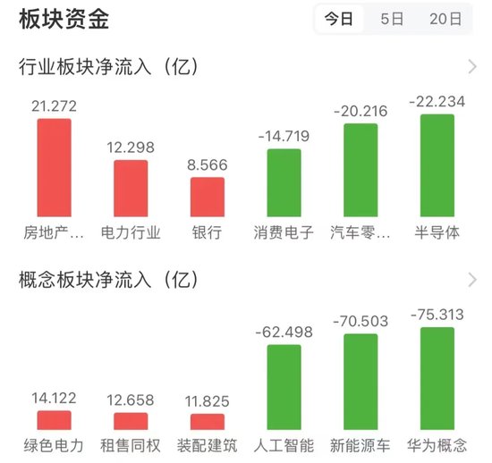 今日,房地产板块持续活跃,消息面上,杭州、西安两大城市先后官宣全面取消住房限购。午后,地产股集中爆发,天池源、南都物业、滨江集团、中交地产、我爱我家等多股涨停。截至收盘,房地产板块主力资金净流入21.27亿元,居资金净流入排名首位。