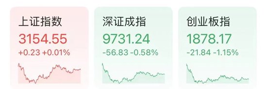 截至收盘,沪指涨0.01%,报3154.55点,深成指跌0.58%,报9731.24点,创业板指跌1.15%,报1878.17点。成交方面,沪深两市全天成交9125亿元。北向资金净卖出63.04亿元。