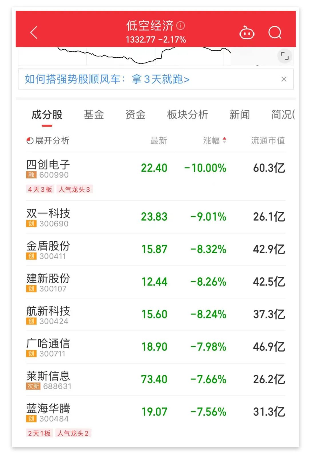 染料、ST板块、半导体等板块跌幅居前。锂电产业链“熄火”,天宏锂电跌近10%,金杨股份、翔丰华、当升科技跌逾6%,宁德时代跌近3%。低空经济概念尾盘跌幅扩大,四创电子上演准“天地板”,双一科技跌超9%,金盾股份、建新股份、航新科技跌超8%。