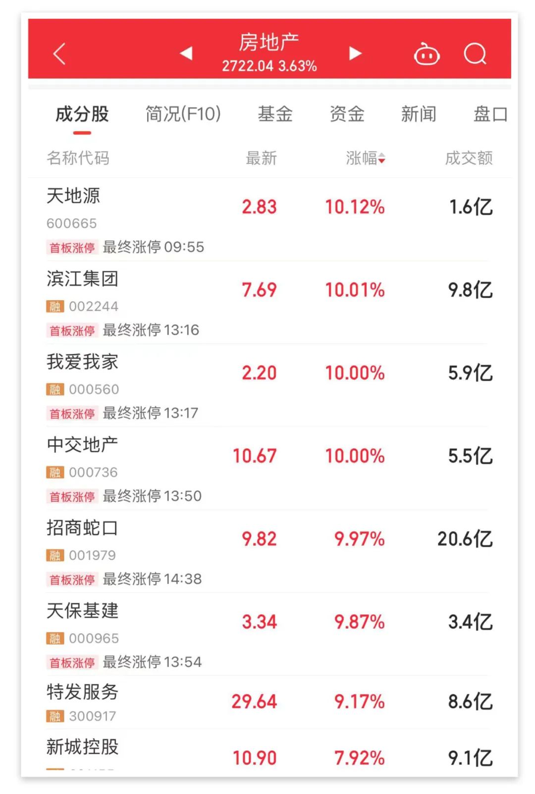 房地产板块兑现利好,A股、H股相关板块双双走强。A股天地源、滨江集团、中交地产、招商蛇口等涨停。港股内房股涨势持续扩大,世茂集团盘中最高涨超93%,华南城最高涨超76%。