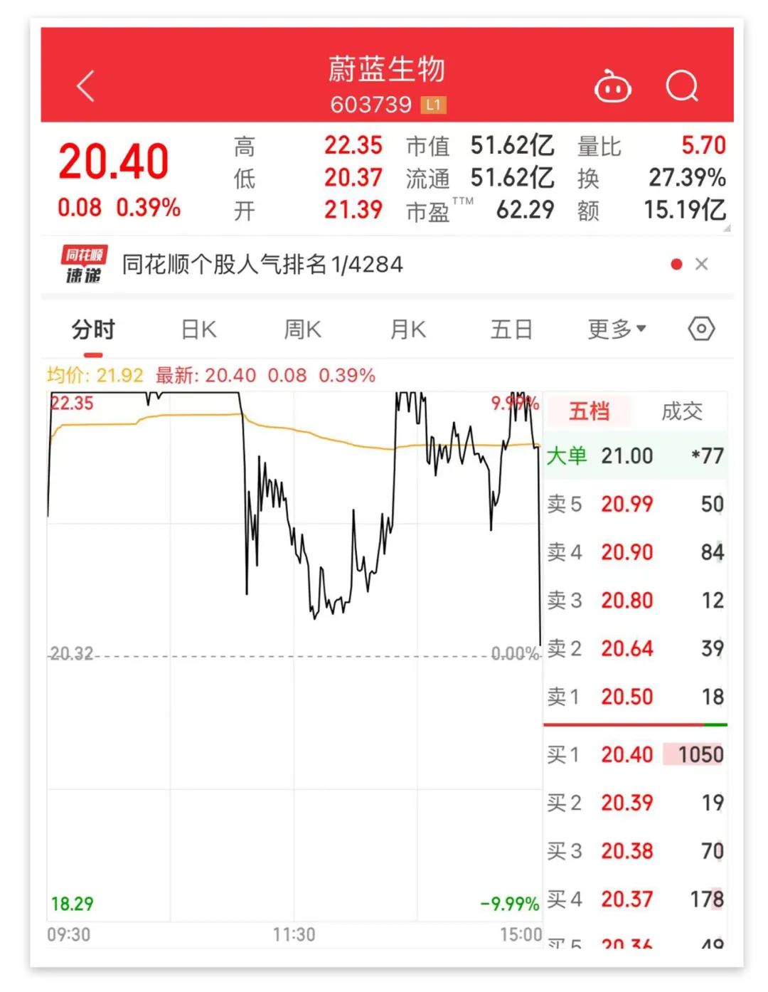 今日尾盘出现罕见一幕。此前7连板的蔚蓝生物最后一分钟突然跳水,截至收盘涨幅收窄至0.39%,全天换手率高达27.39%。