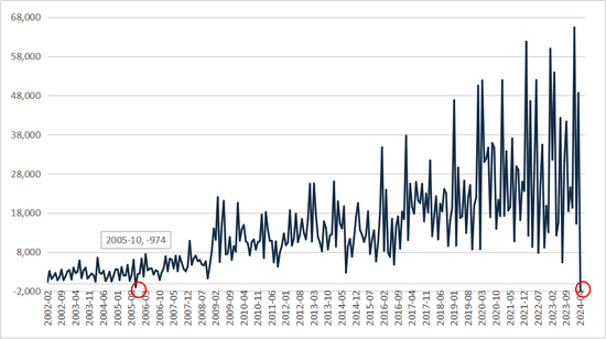 4月份,社会融资规模增量-1987亿元,同比少增14236亿元。主要归因于政府债券融资缓慢(新增-984亿)、未贴现汇票收缩(新增-4486亿)以及企业债券回落(新增493亿)。新增社融罕见转负,上一次还在2005年10月,当时上证指数在1000点。新增人民币贷款7300亿元,同比多增112亿元,主要支撑来自票据融资大幅新增8381亿元。4月广义货币(M2)同比增速由8.3%继续放缓至7.2%,主要受企业部门存款(新增-18725亿)拖累。狭义货币(M1)同比增速由正转负至-1.4%。