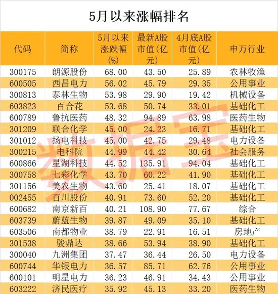 据证券时报·数据宝统计,5月以来涨幅最高的前20只股票当中,15只股票期初A股市值不到50亿元,占比达到75%。朗源股份、西昌电力、泰林生物、百合花、鲁抗医药累计涨幅排在前五位。以朗源股份为例,该股5月以来累计涨幅达到68%,高居A股同期第一位,4月底该股A股市值仅25.89亿元。