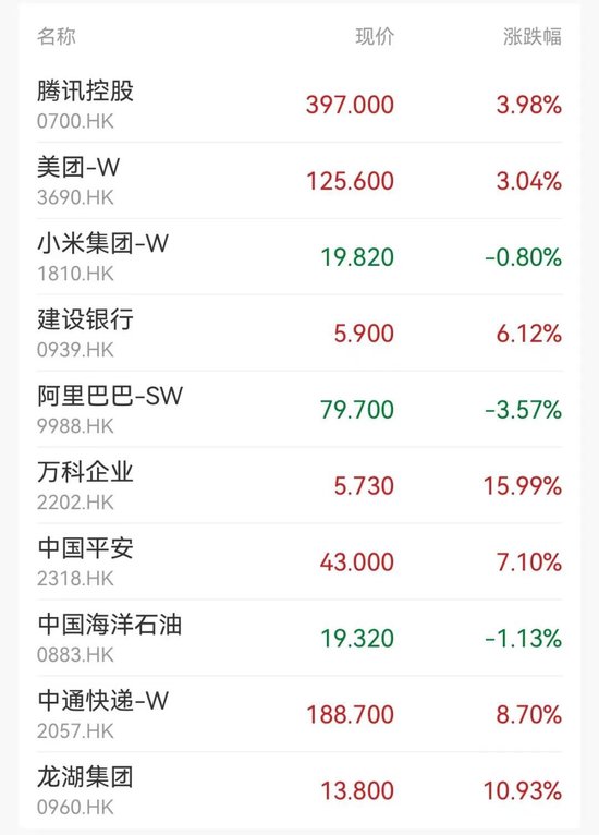 盘面上,内地房产股与物管股表现最为亮眼,远洋集团涨超46%,旭辉控股集团涨近29%,世茂集团涨近18%,万科企业涨近16%,龙湖集团涨近11%,融创中国涨超10%,碧桂园服务涨近6%;建材水泥股等产业链跟涨,中国建材涨近10%,海螺水泥涨超8%,华润建材科技涨近7%;科技股走势分歧,腾讯涨近4%,美团涨超3%,京东、哔哩哔哩涨超2%,阿里跌超3%,小米、百度跌近1%。