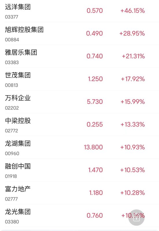 截至收盘,远洋集团涨超46%,旭辉控股集团涨近29%,世茂集团涨近18%,万科企业涨近16%,龙湖集团涨近11%,融创中国、富力地产涨超10%。