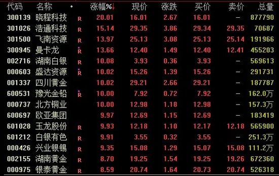 黄金概念盘中走势活跃,截至收盘,晓程科技“20cm”涨停,浩通科技涨超15%,曼卡龙涨超13%,湖南白银、盛达资源、四川黄金、北方铜业、白银有色等均涨停。