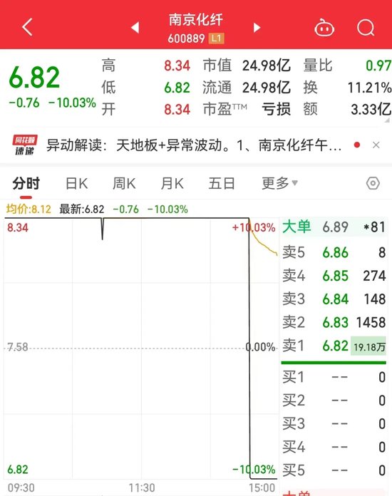 尾盘阶段,大牛股南京化纤突然跳水,短短1分钟内,股价由涨停被砸至跌停板,上演了“天地板”的戏码。此前的6个交易日,该股均录得涨停板,是同期表现最抢眼的股票之一。