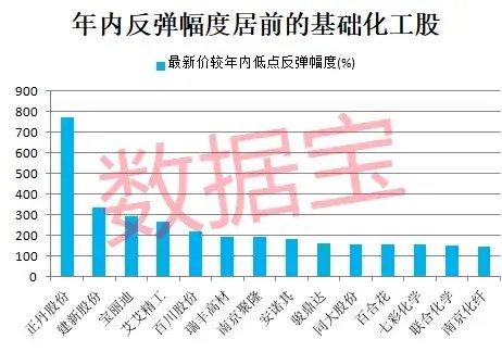 据证券时报·数据宝统计,截至5月20日收盘,基础化工股票当中,最新收盘价与年内低点相比,反弹幅度均值达到53.9%。正丹股份、建新股份、宝丽迪、艾艾精工、百川股份等反弹幅度均超200%。