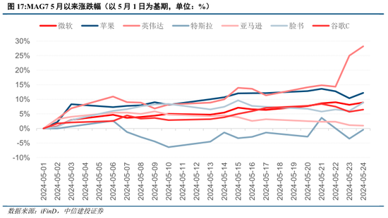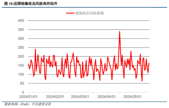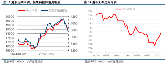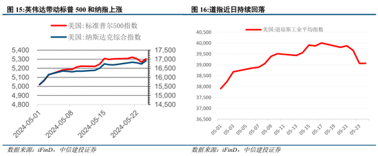 当前市场已对流动性转向紧缩有所反应。从港股市场来看,在经历四月下旬以来的强势上涨后出现回调。5月20日以来,恒生指数累计下跌5.2%;外资属性更明显的恒生科技指数回调更为明显,5月20日以来累计下跌8.1%。港币继前期持续升值后边际走弱,也反映了近期外资流入或有所放缓。从美股市场来看,经济数据公布后美股普跌,虽然英伟达亮眼的财报业绩对标普500和纳指有所提振,但道指却明显下跌,三大指数走势分化。另外,近期地缘政治局势再趋复杂,也对市场的风险偏好有所影响。
