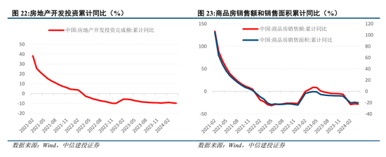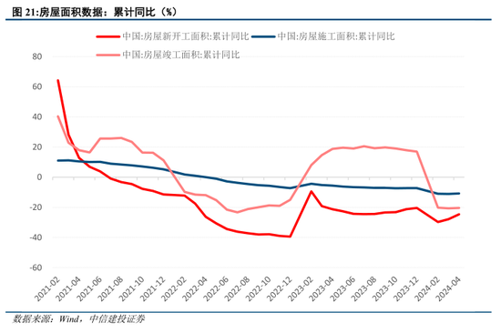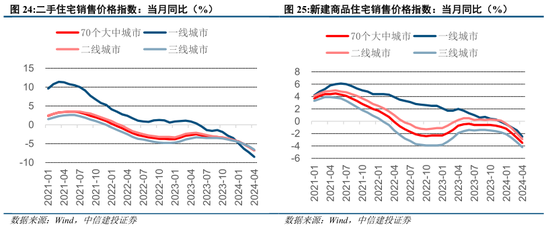 地产高频数据表现依然疲软。2024年前4个月全国房地产开发投资同比下降9.8%,新开工和竣工面积分别同比下降24.6%和20.4%。同时,70个大中城市中,各线城市商品住宅销售价格环比、同比降幅均有所扩大。仍需观察地产政策对于销售、价格等地产核心数据的改善。