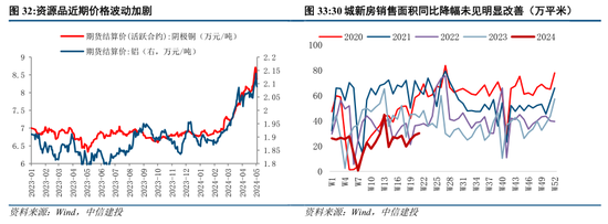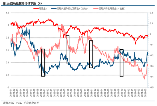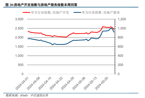 本次地产政策有利于提振商品房市场信心,对房地产市场稳定有积极作用。自地产政策宽松预期以来,市场房地产板块及部分地产链相关行业出现了明显的上涨,04/24最低点至05/17最高点,申万房地产开发板块和房地产服务板块分别上涨27.95%和43.71%,这一阶段的上涨主要为预期地产政策调整下的市场情绪修复。而本周出现了较明显的回落。