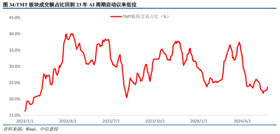 单纯从轮动节奏看,目前年初以来跌幅同样领先,而近期催化增多的科技方向可能也会有一波短期补涨机会。本周英伟达公布最新财报, 25FYQ1营收260亿美元,同比增长262%,超此前指引(240亿)及市场一致预期(246.5亿),下季度指引280亿美元, QoQ+18%,YoY+170%,亦较 268.2 亿美元的一致预期高逾4.4%;25FYQ1净利润达148.8亿美元,同比增长628%,进一步验证AI 算力芯片需求高涨。微软发布第一款Copilot+PC,AIPC换机潮有望陆续启动;而展望6月,COMPUTEX 2024和WWDC 2024将相继召开,有望带动新的硬件创新。从交易额占比看,电子+传媒+计算机+通信四板块已回到23年以来偏低水平。