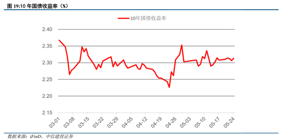 5月15日-16日10Y国债利率累计上行2.1BP。5月9日杭州、西安彻底全面放开限购,当天10年国债利率上行2.3BP。5月17日地产政策落地,央行设立3000亿元保障型住房再贷款、取消房贷利率下限、住房公积金贷款利率下调25BP、首套及二套房首付比率分别下调至15%和25%,但10年国债利率反而下行0.7BP至2.31%。