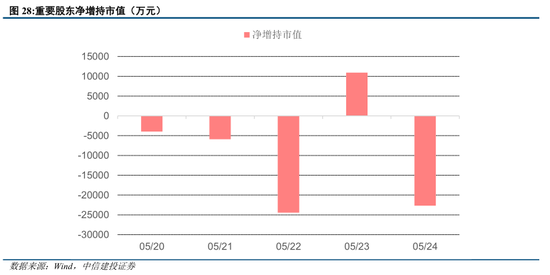 边际上大股东减持小幅度增加。全部A股重要股东净增持市值总和边际下降。过去几个月产业资本连续回流,重要股东增持改善资金面情况。近5个交易日以来,重要股东累积净减持市值4.61亿元。