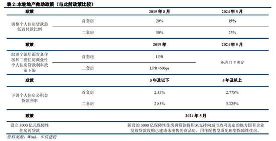 5月17日,地产政策落地。央行宣布取消全国层面首套住房和二套住房商业性个人住房贷款利率政策下限、下调个人住房公积金贷款利率、调整个人住房贷款最低首付款比例和设立3000亿元保障性住房再贷款。有利于提振市场信心,优化库存,降低居民购房门槛,支持有购房需求但实际购房能力受限的居民更容易获得优质住宅。相比2015年,本次地产政策框架有所不同:本次地产政策以真实的保障性住房需求为根基去库存,更强调去库存。2015年更强调扩大有效需求,发布政策后地产开发规模迅速扩大。