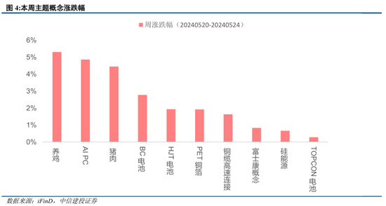 主题概念方面,养鸡、AIPC等相关概念板块涨幅居前。本周养鸡、AIPC、猪肉领涨,分别上涨5.30%、4.86%、4.45%。本周,AI概念热度再起,其中AIPC成为市场关注焦点。本周内,多家公司发布了AIPC产品。美国当地时间5月21日,在Build 2024开发者大会中,微软公司宣布发布全新“Copilot+ PC”。与市场上现有的AIPC相比,微软将旗下AI助手Copilot全面引入了Windows系统,并且内置了OpenAI的GPT-4o模型,其硬件AI算力据称可每秒执行40多万亿次操作。联想集团也发布了首款搭载高通骁龙X Elite芯片的Copilot+ PC产品,预计将于2024年6月正式上市。5月22日,摩根士丹利发布报告称,预计AIPC在笔记本电脑中的渗透率将从今年的约2%提高到2028年的85%左右。与此同时,英伟达于本周发布一季度财报,受此利好带动,AI概念部分细分领域出现大涨。