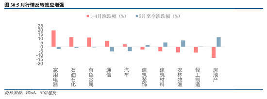 5月以来市场反转效应增强,行情轮动加速。其特征包括,一是行业轮动速率加快,从4月底的科技占优,到5月上中旬的复苏预期交易,再到本周的红利风格。二是高低切现象明显,1-4月涨幅靠前的板块5月以来普遍出现明显回撤,如家电、石油石化、有色金属等,而前期跌幅靠前的领域则出现反转,政策催化下地产链(房地产、建材)表现亮眼。