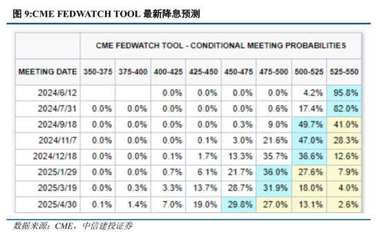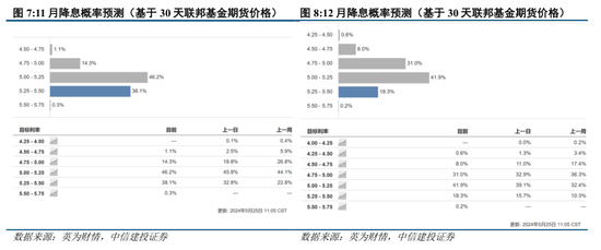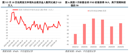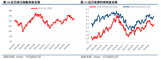 近期重要官员讲话转鹰,强劲经济复苏下市场预期降息时点后移。美联储FOMC周三公布的会议纪要显示,因一季度通胀数据不佳,联储官员预计需要观望比之前他们预期更多的时间,才会对通胀降至目标更有信心,暗示他们不急于降息、高利率会保持更久。多名官员还对表达了一旦通胀重燃就进一步加息的意愿。近期官员讲话普遍偏鹰,认为通胀下降不及预期,对降息更加谨慎。市场的降息预期同样也在降温,周四美国5月标普全球制造业及服务业数据公布后,互换市场交易员将美联储首次降息时间预估从11月推迟到12月。