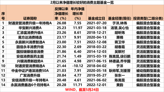 WIND数据显示,2月1日至5月24日,有52只消费主题基金(仅统计主代码)涨超15%,反弹幅度在20%以上的有14只。其中,反弹最迅猛的是由于洋、林伟管理的财通资管消费升级一年持有A,区间累计涨幅达26.08%。今年一季度,该基金重仓了养殖、白酒、家电出海等板块。紧随其后的是汤慧、吴心怡管理的华宝新兴消费A,区间累计涨幅达25.23%。一季度,该基金保持高仓位,加仓了汽车、家电,并在白酒、化妆品等行业做了持仓的调整。