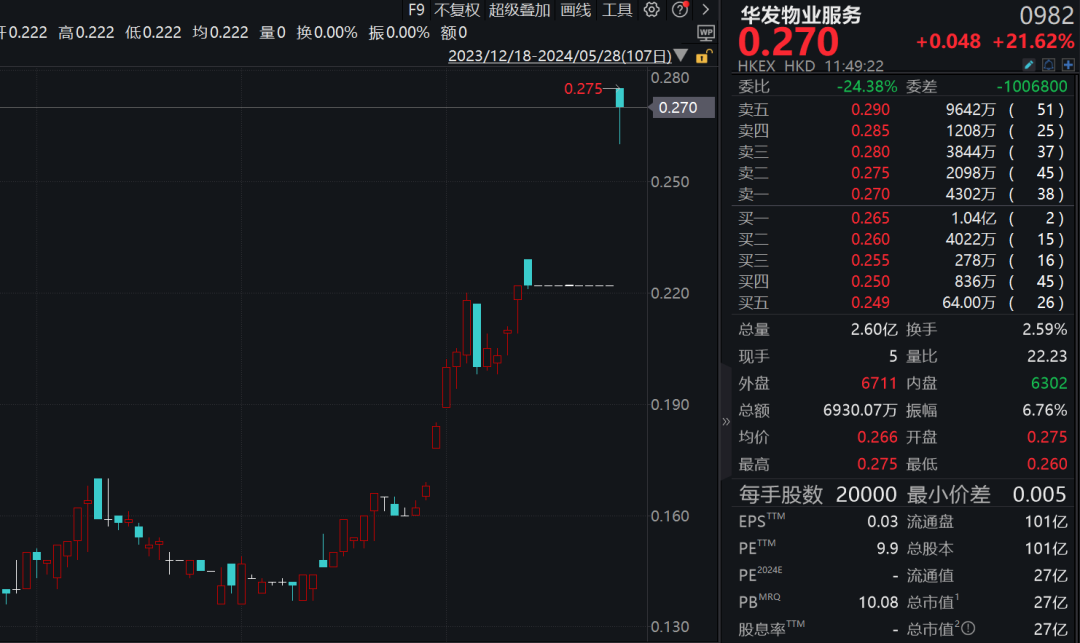 港股市场房地产股今日表现更为强劲。华发物业服务今日复牌,开盘大幅高开近24%,创近4年来新高。截至发稿,涨幅略有缩小,但仍大涨逾21%,成交较停牌前大增200%以上。