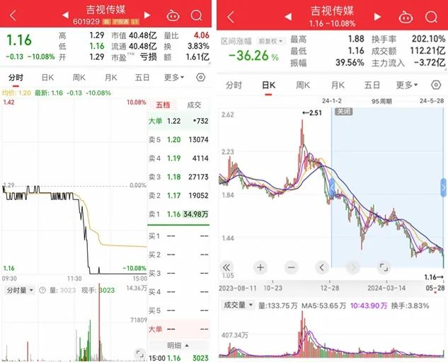 午后,吉视传媒突然闪崩跌停,至收盘报1.16元/股,股价创历史新低。今年以来,吉视传媒累计下跌超36%。