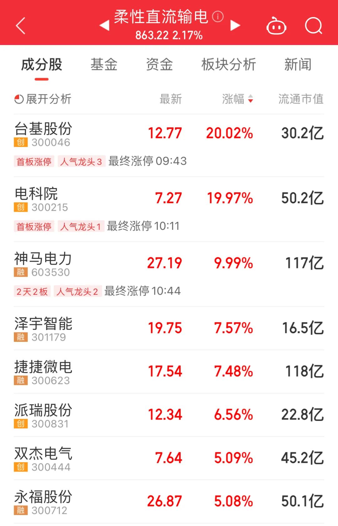 继昨日电力股行情之后,今天电力、柔性直流输电、虚拟电厂、智能电网等多概念板块持续活跃。台基股份、电科院“20CM”涨停,神马电力涨停。