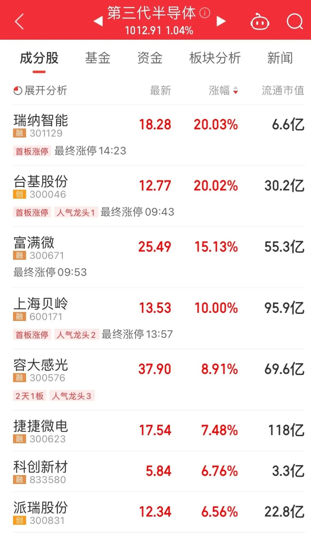 受昨日利好消息刺激,半导体相关板块今日持续活跃。第三代半导体、国家大基金持股等板块均上涨。瑞纳智能、台基股份“20CM”涨停,上海贝岭涨停,容大感光、科创新材等股涨超7%。