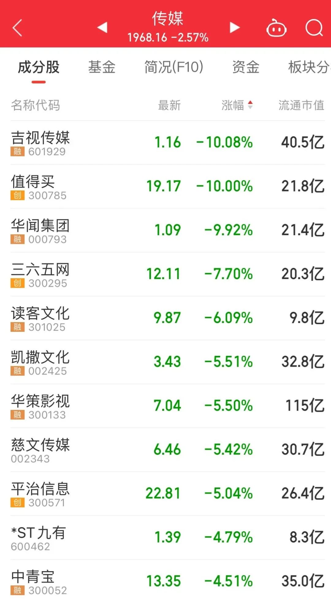 今日,传媒板块震荡调整,板块内个股多数下跌。值得买、华闻集团跌停,三六五网、读客文化跌超6%。