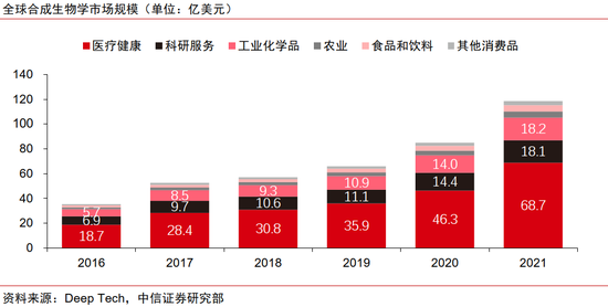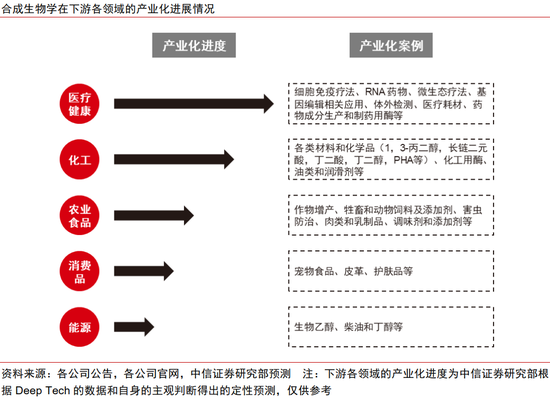 2)化工及新材料:生物制造具有低成本+可持续优势,下游各领域发展前景广阔。合成生物学在化工领域的应用主要包含材料、化学品、化工用酶、油类和润滑剂等多方面。如利用改造后的酵母或其他微生物生产化学品、材料和油类,通过定向进化结合高通量筛选寻找在高温高酸等特殊场景拥有高活性的酶等。生物制造在一些细分小品种领域已经完全取代传统化工,如凯赛生物的长链二元酸、华恒生物的丙氨酸以及缬氨酸、杜邦的1,3-丙二醇等。我们认为随着合成生物学技术的进步,生物制造必然会在化工领域突破大体量产品。