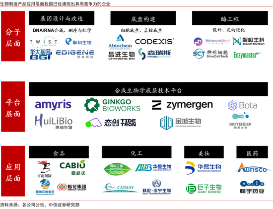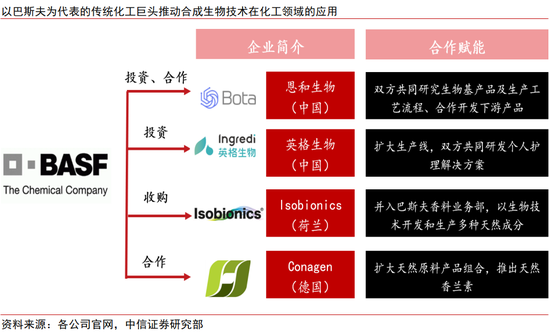 2)大国博弈关键一环,巨头引领生物制造发展。美国政府不断强调生物制造的重要性,推出《国家生物技术和生物制造计划》,制定优先事项和量化目标,提出在20年内,通过可持续且具有成本效益的生物制造途径,生产至少30%的美国化学品需求。与此同时,以巴斯夫为代表的传统化工巨头推动合成生物技术在化工领域的应用,积极寻求生物制造转型。