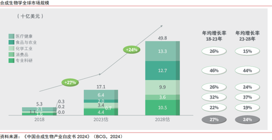 3)食品和农业:有望成为未来增速最快的合成生物学应用领域。食品与农业领域是合成生物最主要的应用场景之一,波士顿咨询(BCG)预计2028年市场规模将达到127亿美元,2023-2028年均增长率超44%。近年来,合成生物学在农业和食品领域的工业化成果主要围绕少数食品配料和添加剂、植物蛋白及发酵蛋白作为替代蛋白、减少肥料使用和碳排放等领域。
