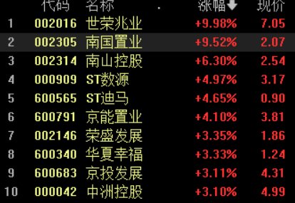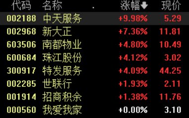 5月29日,地产股早盘冲高回落,截至发稿,世荣兆业、中天服务涨停,南国置业逼近涨停,新大正涨7%,南山控股涨6%。