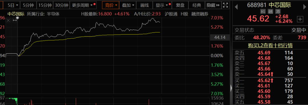 综合指数中,今天表现最强的是科创板指数,而科创板强劲的背后就是半导体。今天,中芯国际全天强势,涨幅一度接近7%。