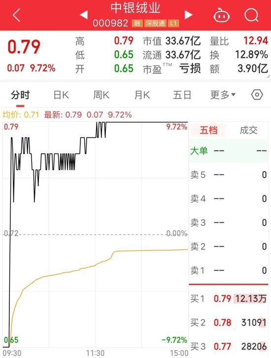 中银绒业上演“地天板”行情,早盘跌停后直线拉升,午后涨停。截至收盘,该股报0.79元/股,成交额3.9亿元,换手率12.89%,总市值33.67亿元。此前,该股已连续三个交易日跌停。