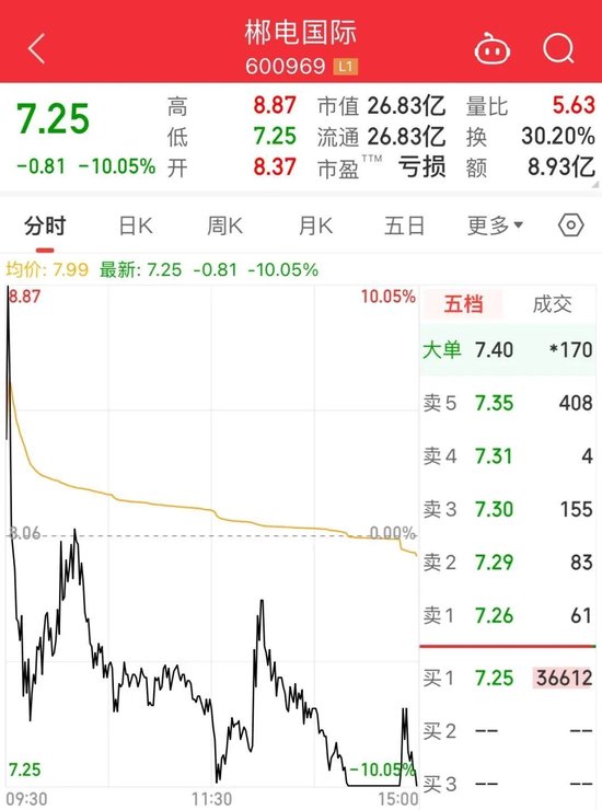 今日,郴电国际早盘触及涨停后,持续走低,股价跌停,上演“天地板”。截至收盘,该股报7.25元/股,成交额8.93亿元,换手率30.2%,总市值26.83亿元。此前,该股已连续四个交易日涨停。