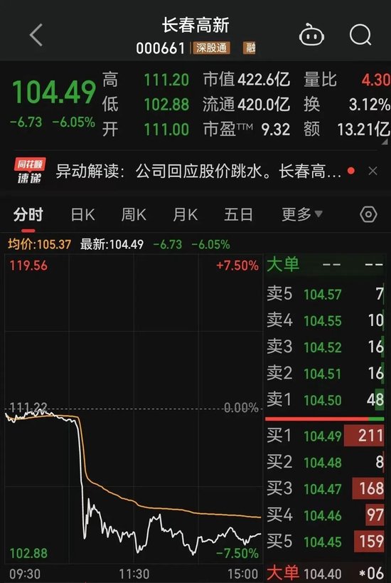 5月30日,有“东北药茅”之称的长春高新在盘中出现快速跳水。截至收盘,长春高新报于104.49元/股,跌6.05%,最新市值422.6亿元。