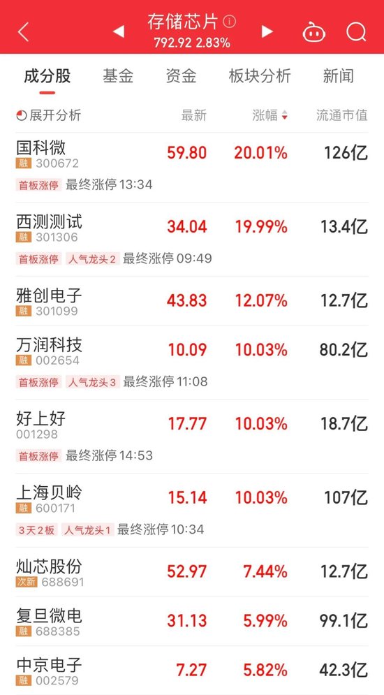 今天,储存芯片、汽车芯片、国家大基金持股、太赫兹、中芯国际概念等多板块均涨超2%。国科微“20CM”涨停,人气龙头万润科技、上海贝岭涨停。