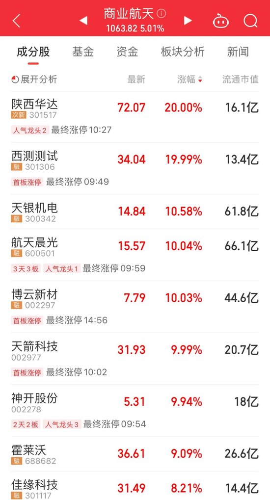商业航空概念股早盘冲高后持续走强,板块内多股涨停。截至收盘,商业航天概念涨5.01%,领涨行业板块。陕西华达、西测测试“20CM”涨停,航天晨光等股涨停。