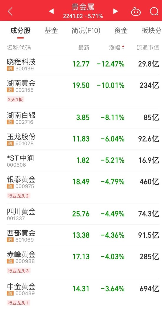 昨日表现强势的有色金属板块今日集体下行。贵金属、金属锌、金属铅、工业金属、黄金概念跌幅居前。其中,贵金属板块内个股全线飘绿。龙头股湖南黄金跌停,晓程科技跌超12%。