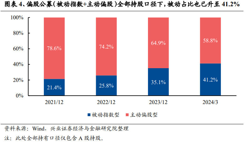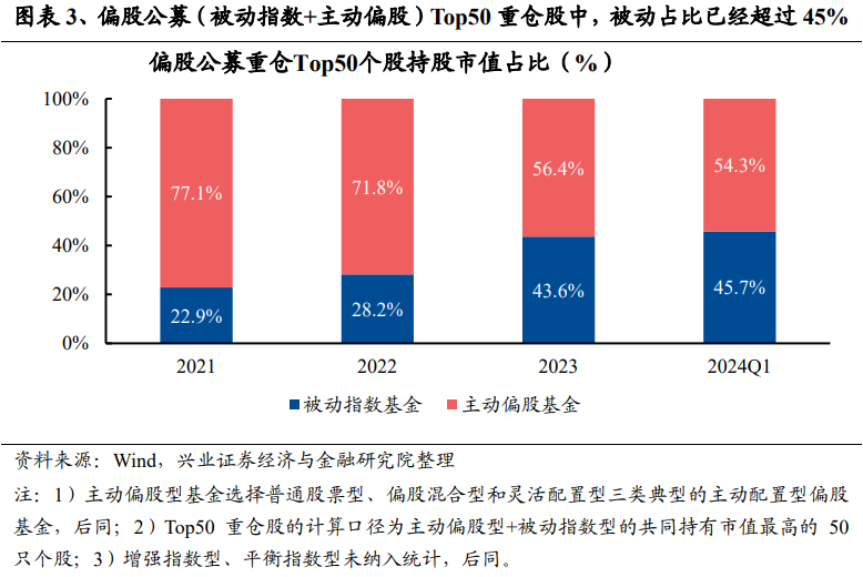 更重要的是,被动基金持股占比快速提升,当前公募前 50 重仓股中被动与主动 占比已经接近 1:1。截至 2024Q1 末,偏股基金(被动指数+主动偏股)的 Top50 重仓股中,被动基金的持股占比已经跃升至 45.7%,与主动基金占比接近 1:1,而 2021 年底被动占比仅有 22.9%。偏股基金的全部持仓口径下,被动基金的持股占 比也已经升至 41.2%,而 2021 年底占比仅有 21.4%。