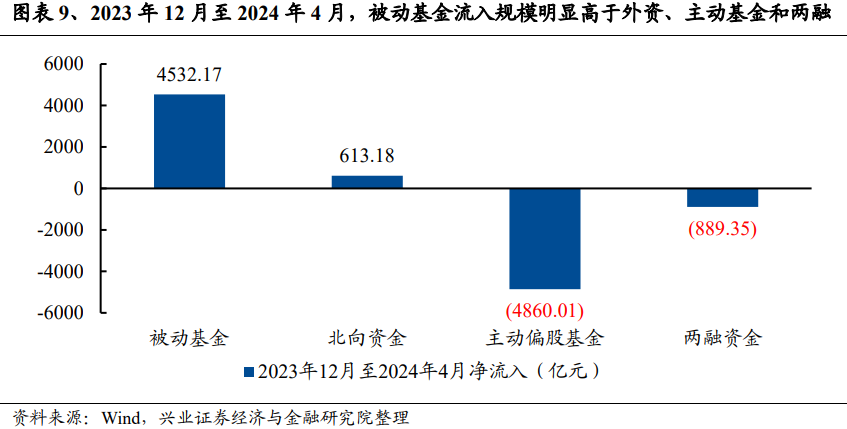 去年底以来,被动基金增量流入的规模远超外资、主动基金和两融,成为市场最 主要的增量资金来源之一。
