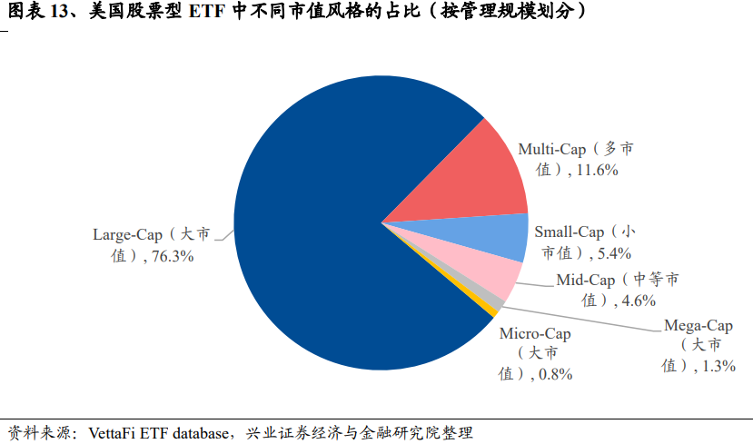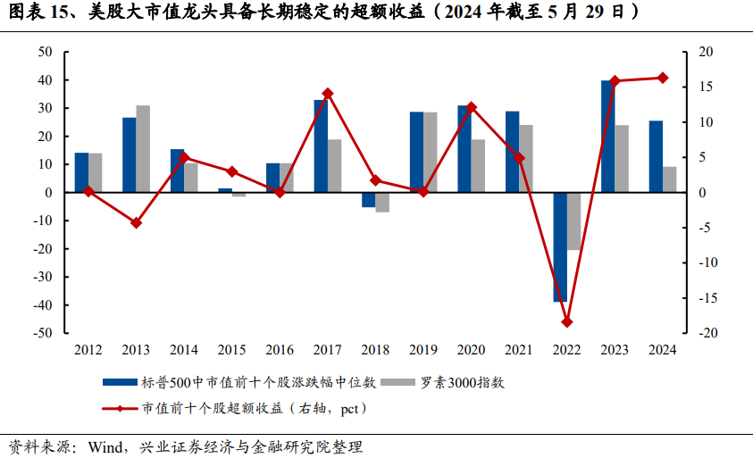 被动基金扩容是美股龙头长期跑赢的重要原因。按市值风格划分,美国股票型 ETF 中聚焦大市值风格的 ETF 占比达到了 76%。按 ETF 划分,规模排名前三的 ETF 均跟踪标普 500 指数、其规模占比已经超过 20%。聚焦大市值股票、高集中度、 持续扩容是美国被动基金市场的三大主要特征,其扩容对龙头长期跑赢起到了重 要推动作用。