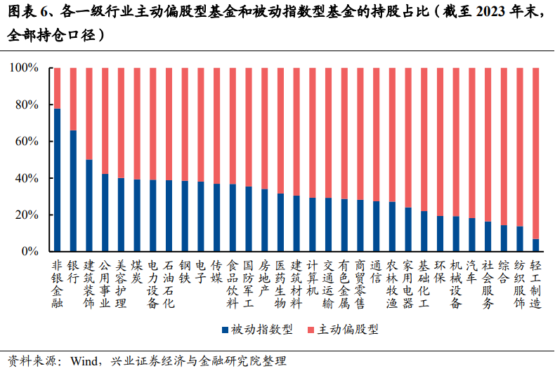 截至 2023 年末,基金年报披露的全部持仓口径下,非银金融、银行和建筑装饰 行业的被动基金持股占比已经高于主动基金,被动占比分别是 77.9%、66.0%、 50.2%,公用事业、美容护理、煤炭、电力设备、石油石化、钢铁、电子等行业 的被动基金占比也较高,均超过或接近 40%。