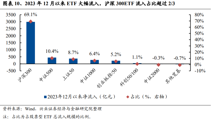 被动基金成为龙头取得超额收益的重要驱动。2023 年 12 月以来,股票型 ETF 共 计流入近 4300 亿元,且主要流向宽基类 ETF。拆分来看,仅跟踪沪深 300 指数的 ETF 就净流入 2990 亿元,占全部流入规模的 2/3 以上,沪深 300ETF 大幅流入带 动龙头权重股取得显著超额收益。