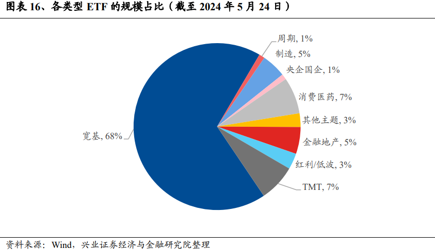 若国内被动基金扩容持续,龙头风格有望长期受益。当前来看,跟踪沪深 300、 科创 50、上证 50 等大市值指数的宽基类 ETF 仍是市场主流。截止 2024 年 5 月 24 日,宽基 ETF 占比 68%,其中沪深 300 在宽基中占比 46.4%。若国内被动基金 扩容持续,龙头风格有望长期受益。