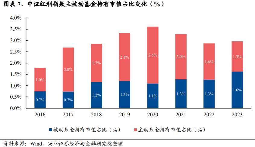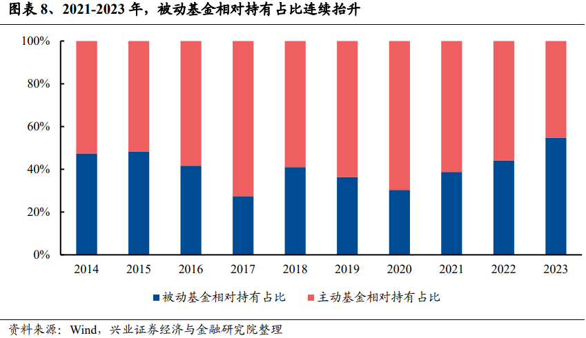 不止行业层面,这两年具有代表性的红利风格中被动基金的占比在 2023 年也首 次超过主动基金。以中证红利指数成分股作为代表,截至 2023 年末,被动基金持 有中证红利的市值占比已经超过了 1.6%,且过去十年来首次超越主动基金(1.3%)。从相对占比角度,2023 年末中证红利中被动与主动占比分别是 55%、45%