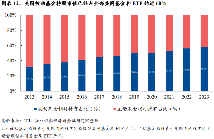 参考美国,过去十几年间被动基金加速扩容。2008 年金融危机后,美国被动型产 品加速扩容。2014 年至 2023 年,投资美国国内的被动指数型基金合计获得了约 2.5 万亿美元规模的资金净流入。至 2023 年底,美国被动基金持股市值已经占全 部共同基金和 ETF 的近 60%。